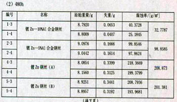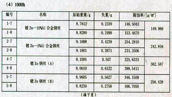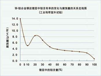 由試驗結果可以看出,鍍層中鋁含量為10%的時候,腐蝕量為5g/m2/年。而鋁含量繼續(xù)上升的時候,腐蝕量反而升高,一直到鋁含量達到40%的時候,才又達到5g/m2/年。于是,就抗腐蝕的能力及經(jīng)濟的角度來說,用熱鍍10%鋁鋅合金鋼絲最為合適。